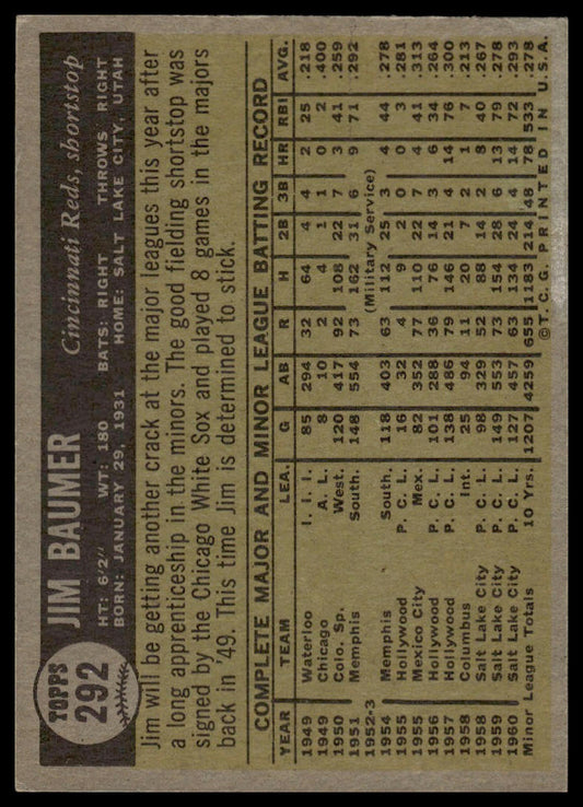 1961 Topps #292 Jim Baumer Cincinnati Reds Rookie Excellent