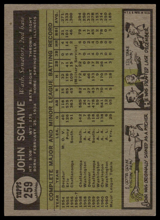 1961 Topps #259 John Schaive Washington Senators Rookie VG-EX