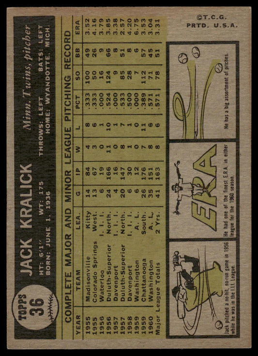 1961 Topps #36 Jack Kralick Minnesota Twins Rookie Excellent