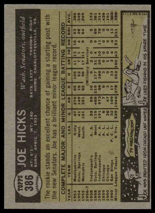 1961 Topps #386 Joe Hicks Washington Senators Very Good