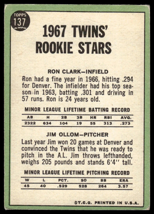 1967 Topps #137 Rookie Stars (Ron Clark / Jim Ollom) Minnesota Twins Rookie VG