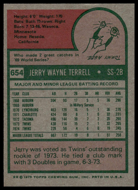 1975 Topps #654 Jerry Terrell Minnesota Twins Excellent