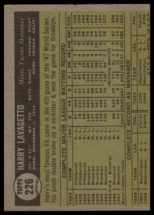 1961 Topps #226 Harry Lavagetto Minnesota Twins Excellent