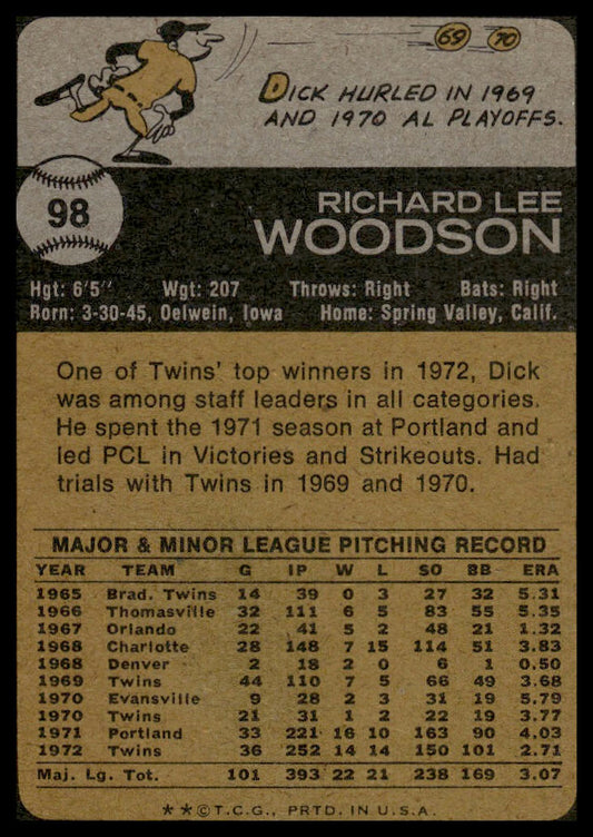 1973 Topps #98 Dick Woodson Minnesota Twins Excellent Centered