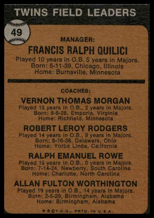 1973 Topps #49a Frank Quilici Minnesota Twins EX