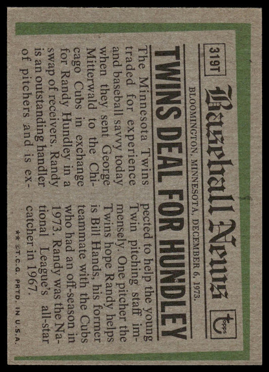 1974 Topps #319T Randy Hundley Minnesota Twins EX