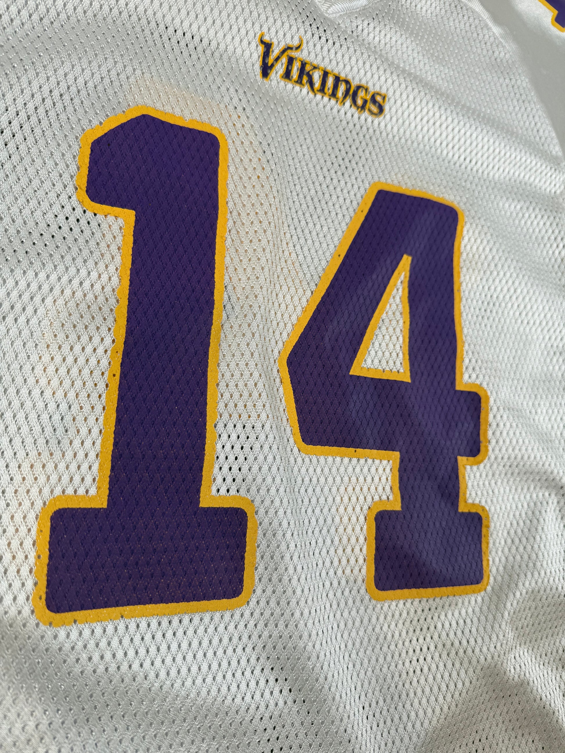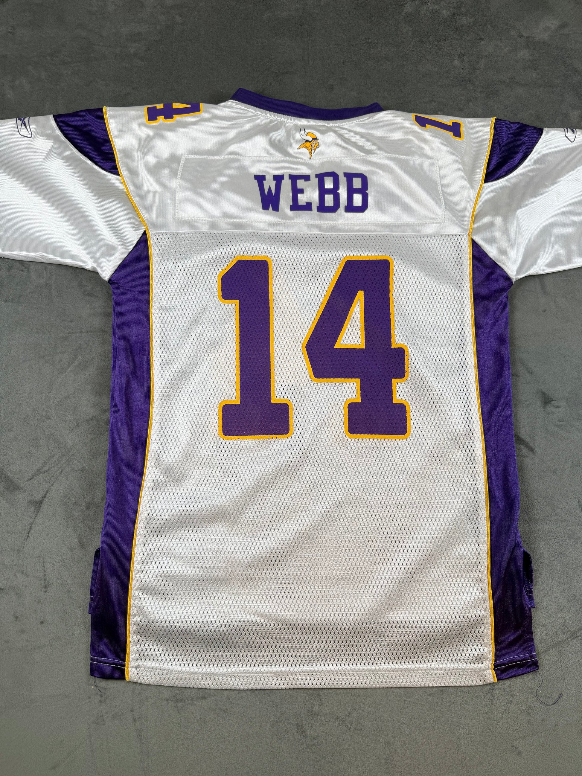 Rep your Vikings pride with this Joe Webb #14 Minnesota Vikings NFL Reebok Jersey in youth size large. Featuring the classic white mesh with purple and gold accents, this officially licensed NFL jersey is perfect for game day or casual wear.